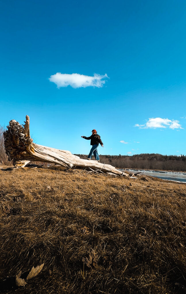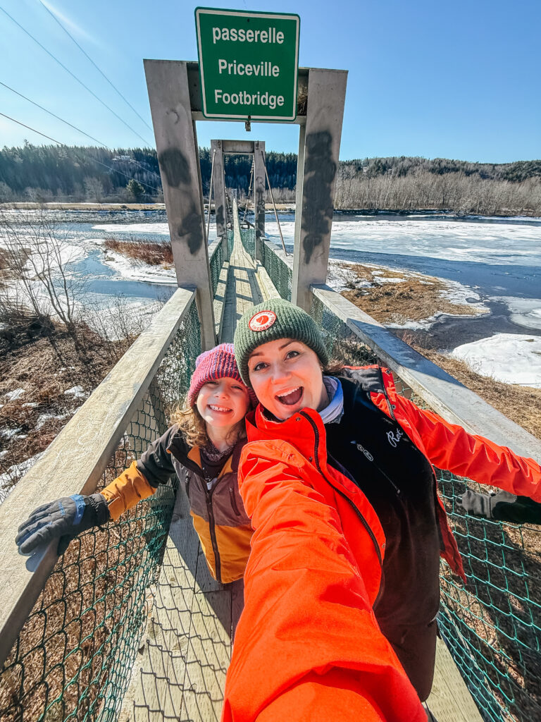 The bridge sways slightly when you walk it, which the kids thought was thrilling and which I pretended not to notice. As a result, the views from the middle are genuinely stunning, river stretching out in both directions, ice breaking up in the current, the treeline on both sides. On a clear day it’s the kind of view that makes you take twenty photos and still not feel like you got it.