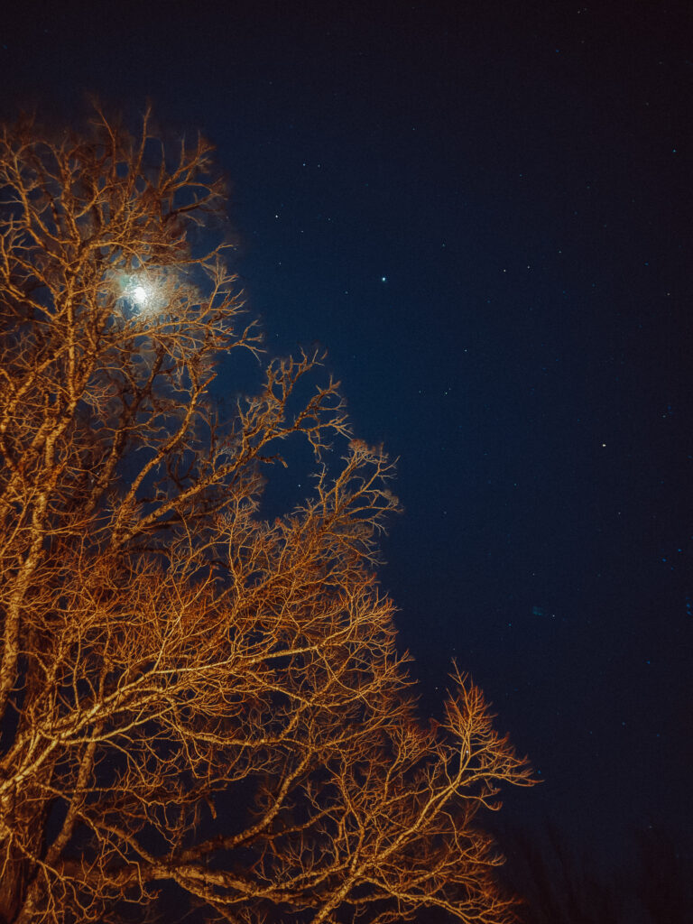 I live in a city. I forget what the sky actually looks like. Out here, away from the light pollution, the moon was so bright it was throwing shadows, and there were more stars visible than I’ve seen in years. I took a photo and it doesn’t do it justice, but I took it anyway.