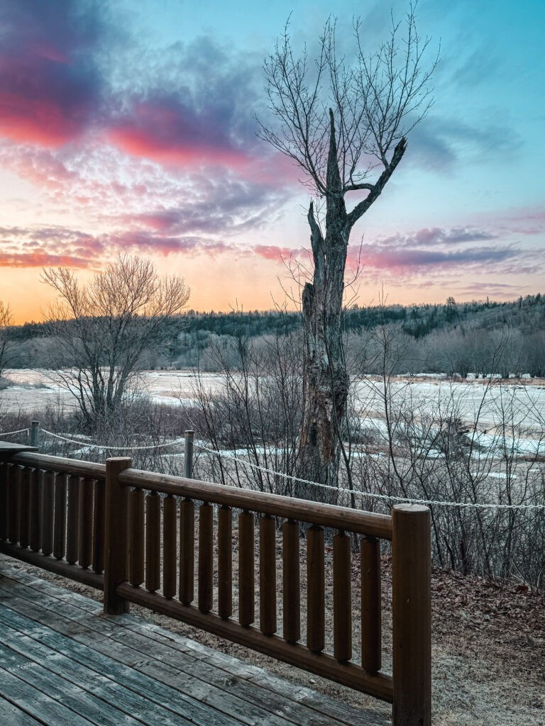 The river was still mostly frozen when we visited in late March, which sounds like it would be bleak, but it wasn’t. It was beautiful in the way that only late winter New Brunswick can be, that specific pale gold light on the ice, the bare trees, the sky going pink at the edges before it turned blue.